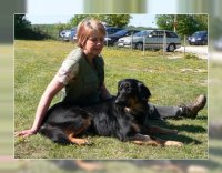 | CAC Barsinghausen | 25. Mail 2014 | Veteranenklasse, Platz 2, Res.-Anw. Dt. Vet.Ch. VDH | Eine knapp 9 Jahre alte SM-Hündin, mittelgroß und mittelkräftig mit kräftigem Kopf, hinten und tief angesetzten Ohren, die nicht ganz anliegend getragen werden, mittelbraune Augen und komplettes Scherengebiss. Leicht offene Lefzen, Rute korrekt, im Stand korrekte Winkelungen, in der Bewegung leicht ausdrehenden Ellbogen, sehr flüssiges ausgreifendes Gangwerk in der Kreisbewegung, tiefschwarzes Deckhaar von optimaler Länge und Struktur, komplette mittelblonde Markenzeichnungen, am Fang nicht klar abgegrenzt, kleiner weißer Brustfleck. Die Hündin zeigt sich ruhig und sicher im Ring und wird in optimaler Kondition vorgeführt. |