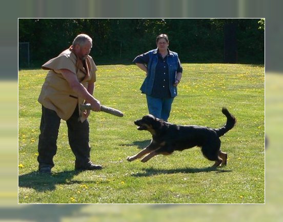 Auf dem Platz zeigte sie sich dann interessiert und aufgeschlossen allen Menschen und Dingen gegenüber. Das Messen, Vortraben und die Beutespiele bereiteten keine Probleme, ebenso wenig die Menschengruppe, der Klappersack und die Puppe. Beim abschließenden Spielen zeigte sie noch, was in ihr steckt.