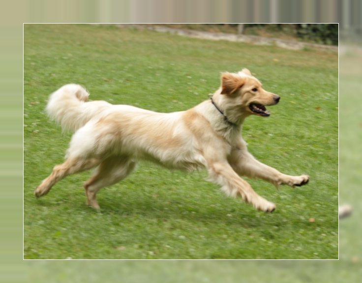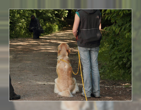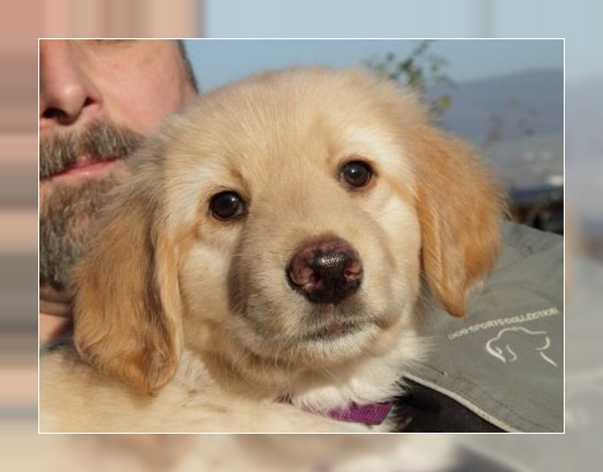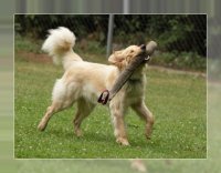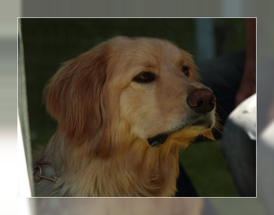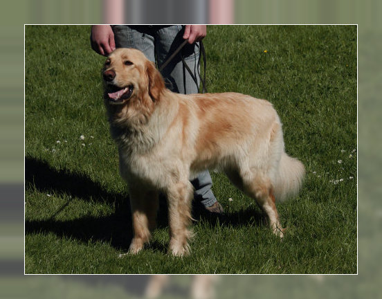 Eine gut 3,5 Jahre alte blonde Hündin von derbem Typ mit kräftigem Kopf und mittelbraunen Augen. Scherengebiss, wobei der il oben links fehlt (Attest liegt vor). Rücken und Rute in Ordnung. Der linke Behang ist korrekt, der rechte wird nicht ganz anliegend getragen. Gerade Läufe, korrekte Winkelungen. Mittleres Pigment mit Wechselnase. Vorzügliches Fellstruktur und - farbe. Federndes Gangwerk in der Kreisbewegung. Freundliches und lustiges Wesen.